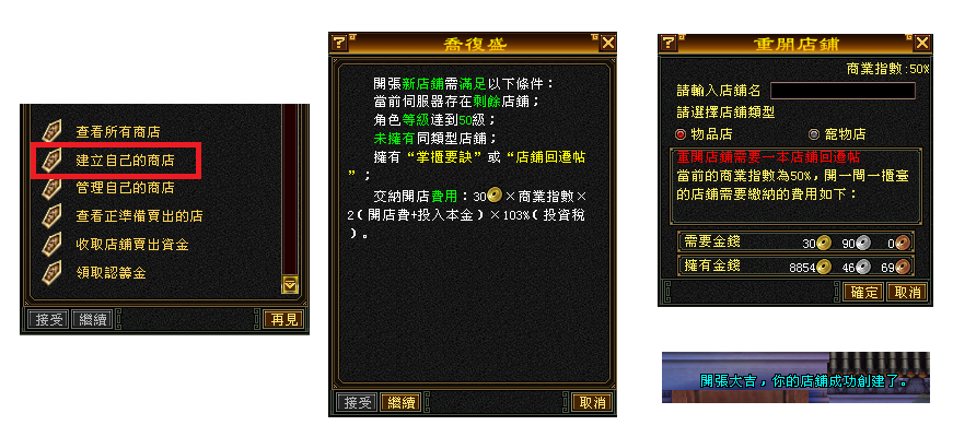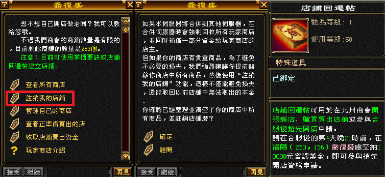 ★此時間還是可以至洛陽的喬復盛(230,156)的對話功能選項選擇進行(註銷我的店舖)