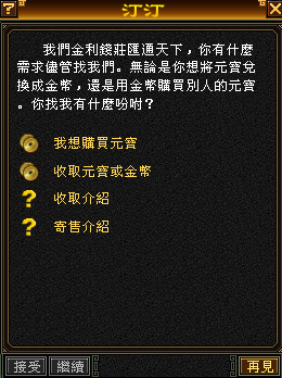 ★2025年8月14日 10:00關閉洛陽的汀汀和冬冬(159,181)對話功能選項的(我想寄售元寶),但前日其他玩家已寄售的元寶還是可進行購買的