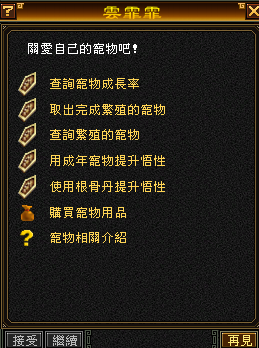 ★2025年8月14日 10:00關閉蘇州的雲霏霏(86,142)對話功能選項的(寵物繁殖),但之前已有進行繁殖中的寵物還是可進行取出的
