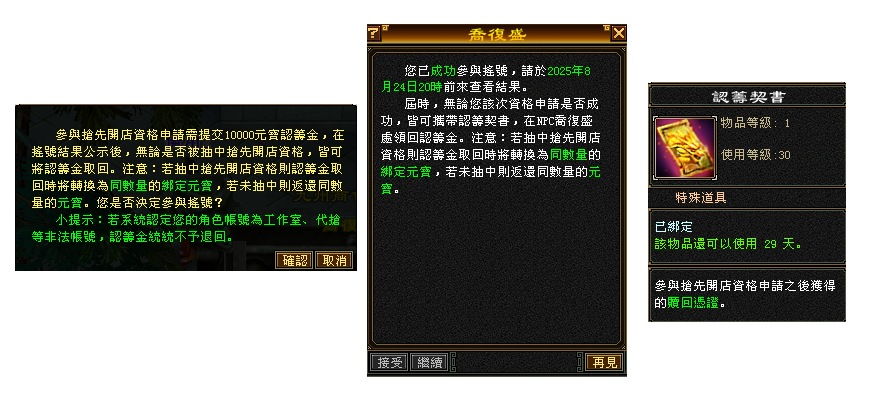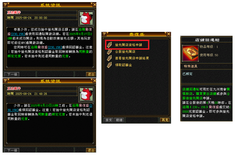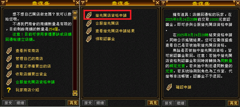 ★點擊(合服搶先開店資格申請)->在點擊(搶先開店資格申請)->成功申請後->將會出現(你已成功參與搖號,請於2025年08月24日20時,在前來查看結果等等資訊;如身上元寶不足夠,則將會申請失敗,並且出現(你的背包內元寶數量不足10000,無法申請搶先開店資格)