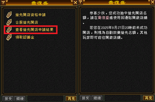 ★點擊(合服搶先開店資格申請),在點擊(查看搶先開店申請結果)->如成功被抽中->將會出現抽中訊息!此外請務必在2025年08月27日19:59前完成開店