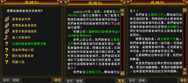 2025年8月11日10:00後,地圖上的(幫NPC)對話功能選項新增(合服的幫會城市處理方案),點擊(合服的幫會城市處理方案)後可看到說明