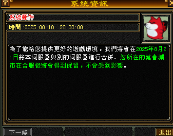 3.請特別注意!收到(系統郵件)通知(為了能給您提供更好的遊戲環境,我們將會在2025年8月21日將本伺服器與別的伺服器進行合併,您所在的幫會城市在合服後將會得到保留,不受影響),此訊息為錯誤的!