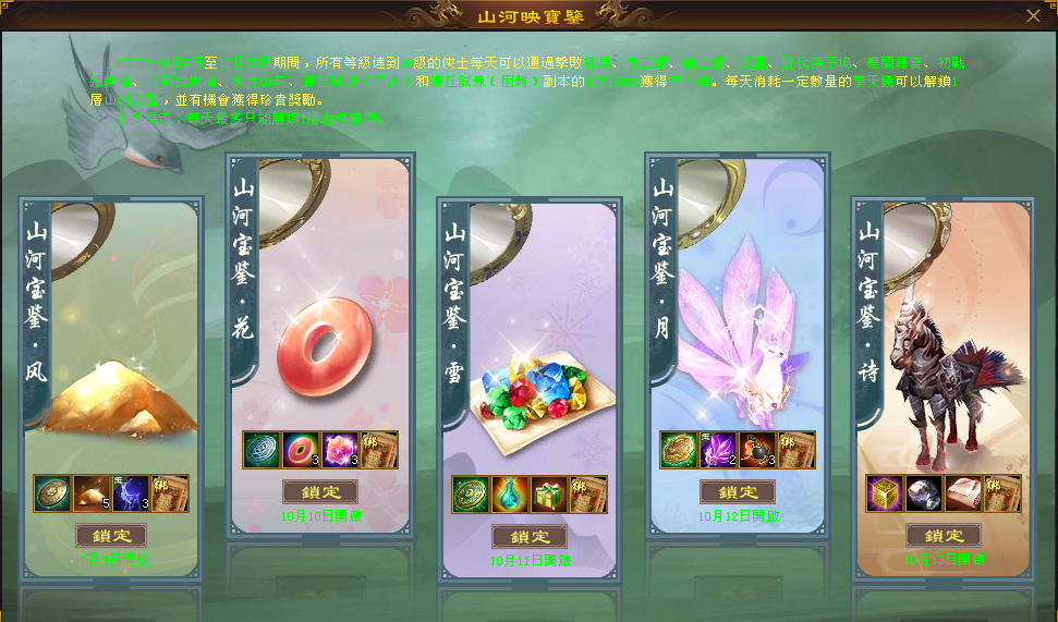 2.活動期間達到30等級以上的角色可透過進入到指定副本內並且擊敗指定的最終BOSS來獲得(擎天鏡),用指定數量的(擎天鏡)可用來開啟(山河寶鑒)