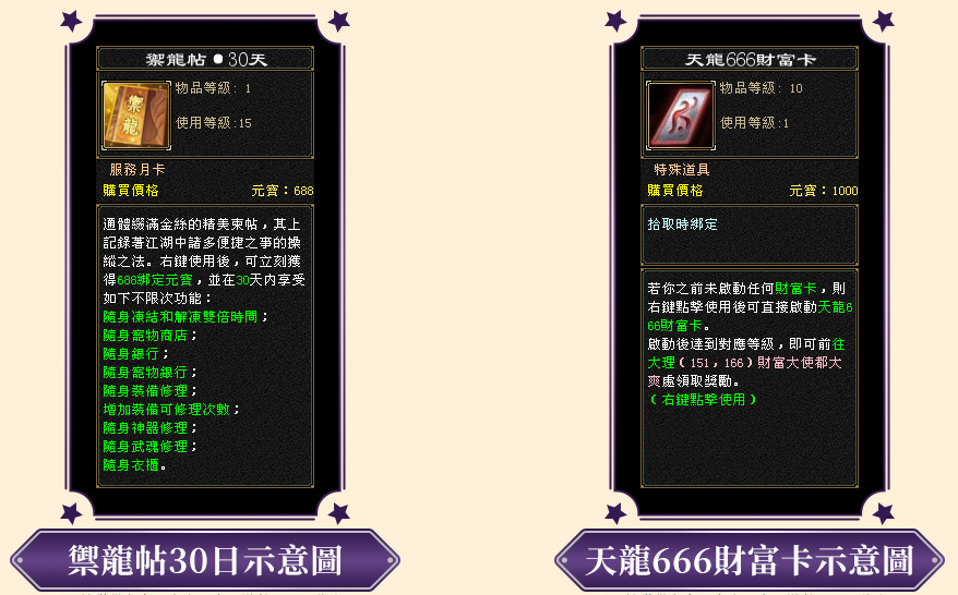 角色等級達到10等級並完成入門派,可與大理的NPC(145,139)錢龍領取禦龍帖30日(綁定)1個、天龍666財富卡(綁定)1個