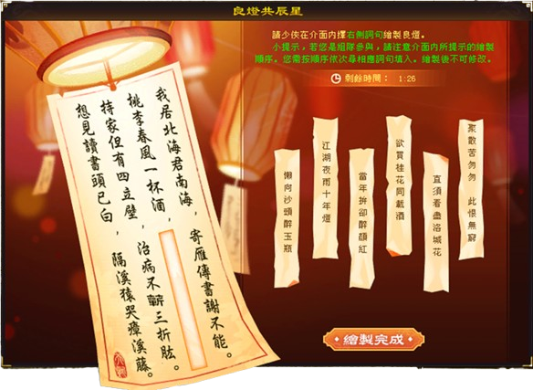 2.成功參加(良燈共辰星)活動後,可在(良燈)上繪製相應詩句,每次繪製詩句需要消耗6個(繪燈雅券),繪製完畢可獲得豐富獎勵