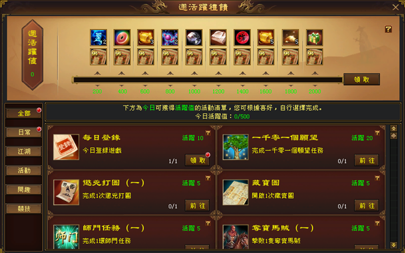 小提醒:週活躍禮饋的週活躍值-活動清單的(華山論劍)可獲得活躍值項目-參與一次華山論劍,請務必完整參加(個人賽)及(門派賽)