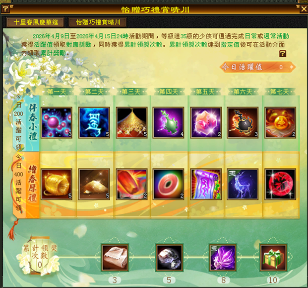 3.每日達成(200活躍值),可於介面點擊獲得對應的(伴春小禮)、每日達成(400活躍值),可於介面點擊獲得對應的(繪春厚禮)