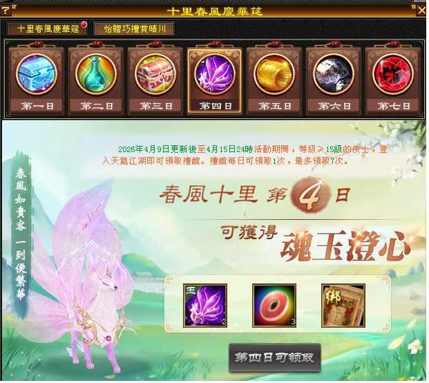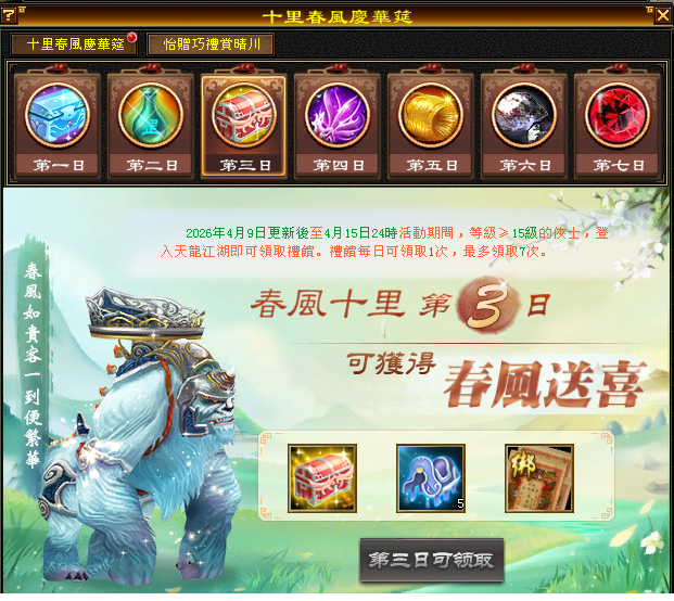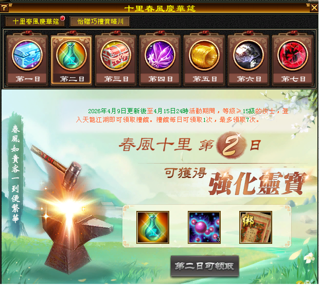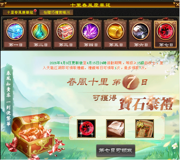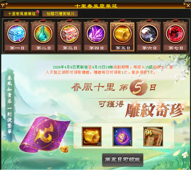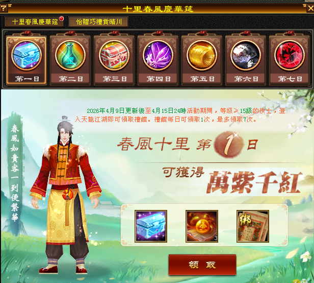 1.角色達到15等級,可至遊戲介面(右上方)的(描春意)進行點擊參加(十里春風慶華筵)活動