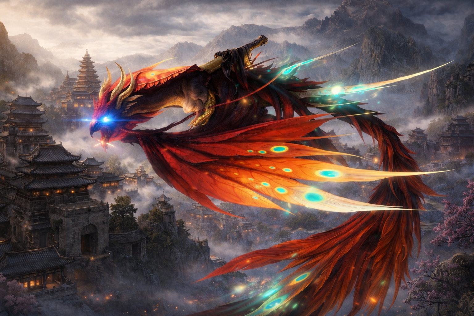 孤影巡九嶽,焰翼覆千峰,一嘯山河顫,萬古火為宗